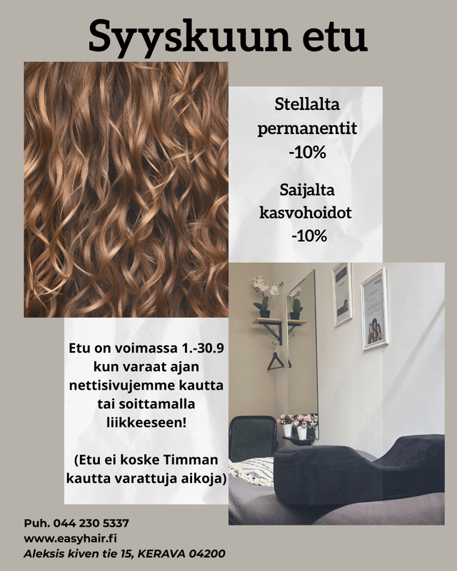 Me Easy Hairissa palvelemme sinua ilolla ja ammattitaidolla. Palveluihimme kuuluu, hiustenväri/ raidoitus- ja leikkauskäsittelyt. Myös kampaukset ja ripsipidennys palvelut. Olemme koko perheen parturi-kampaamo.