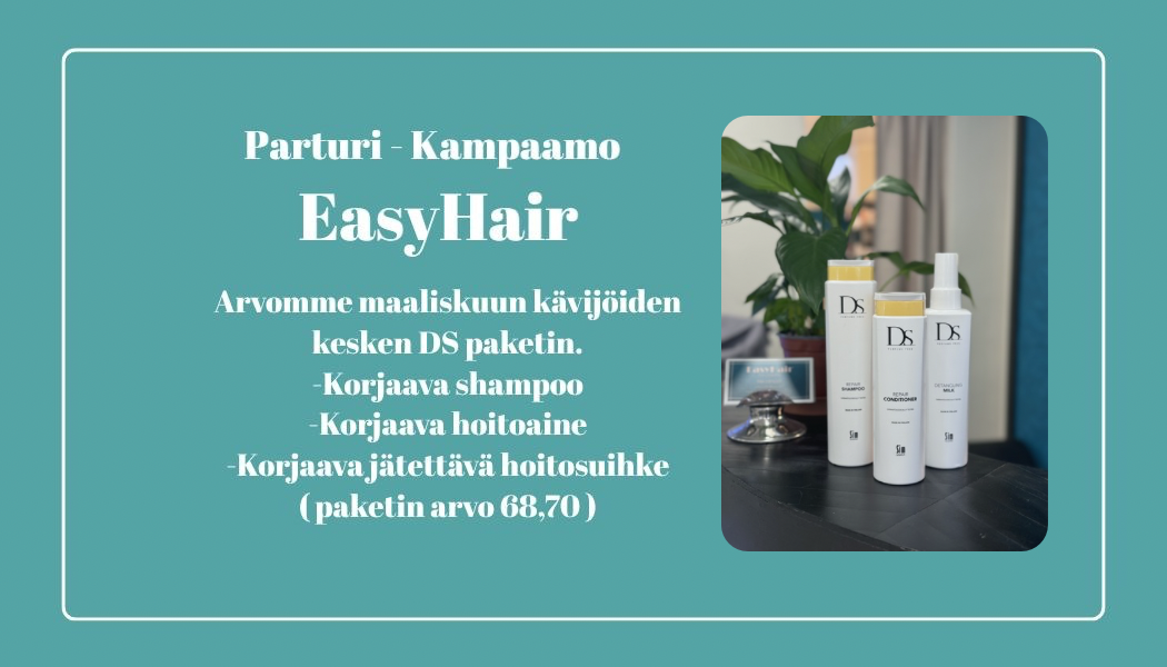 Me Easy Hairissa palvelemme sinua ilolla ja ammattitaidolla. Palveluihimme kuuluu, hiustenväri/ raidoitus- ja leikkauskäsittelyt. Myös kampaukset ja ripsipidennys palvelut. Olemme koko perheen parturi-kampaamo.